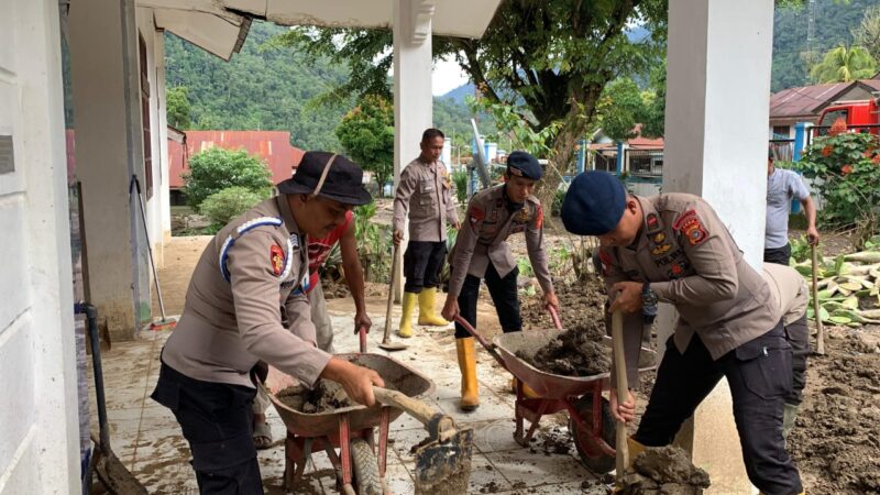 Sejak pagi hari, personel Satbrimob Polda Aceh Kompi 4 Batalyon C Pelopor tampak bahu-membahu melaksanakan pembersihan sisa lumpur, sampah, serta material banjir yang menggenangi lingkungan sekolah.