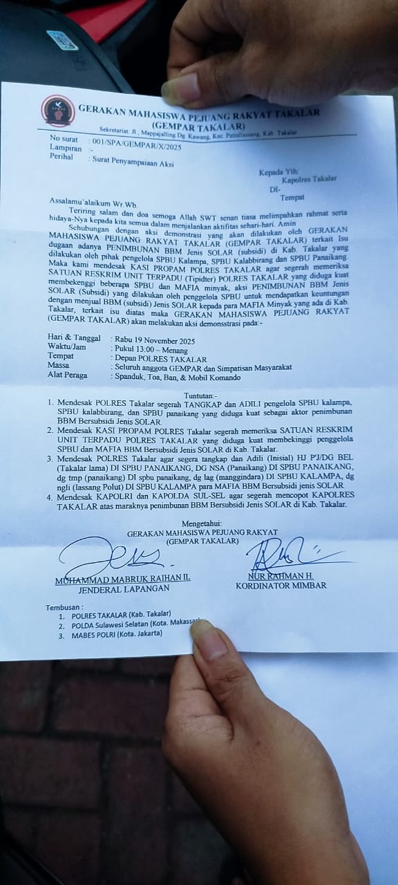 Takalar – tribarata24.net | Gerakan mahasiswa pejuang rakyat (Gempar Takalar) sorot dugaan penimbunan BBM jenis solar subsidi Takalar dilakukan pihak pengelola SPBU kalampa , SPBU Kalakbirang, SPBU Panaikang , ungkap tertulis dalam suratnya bertanda tangan Jendral lapangan mabruk Raihan il &kordinator lapangan Nur Rahman H